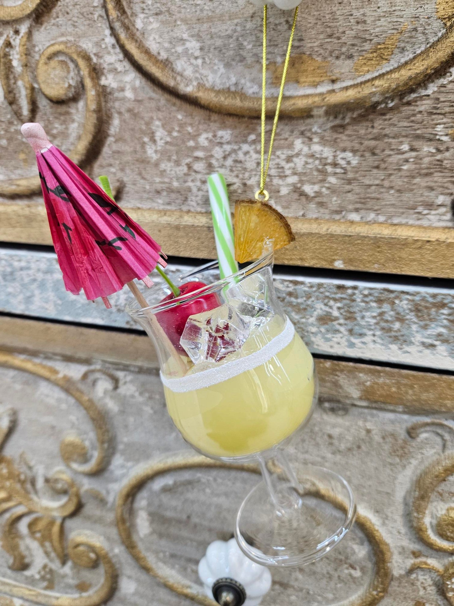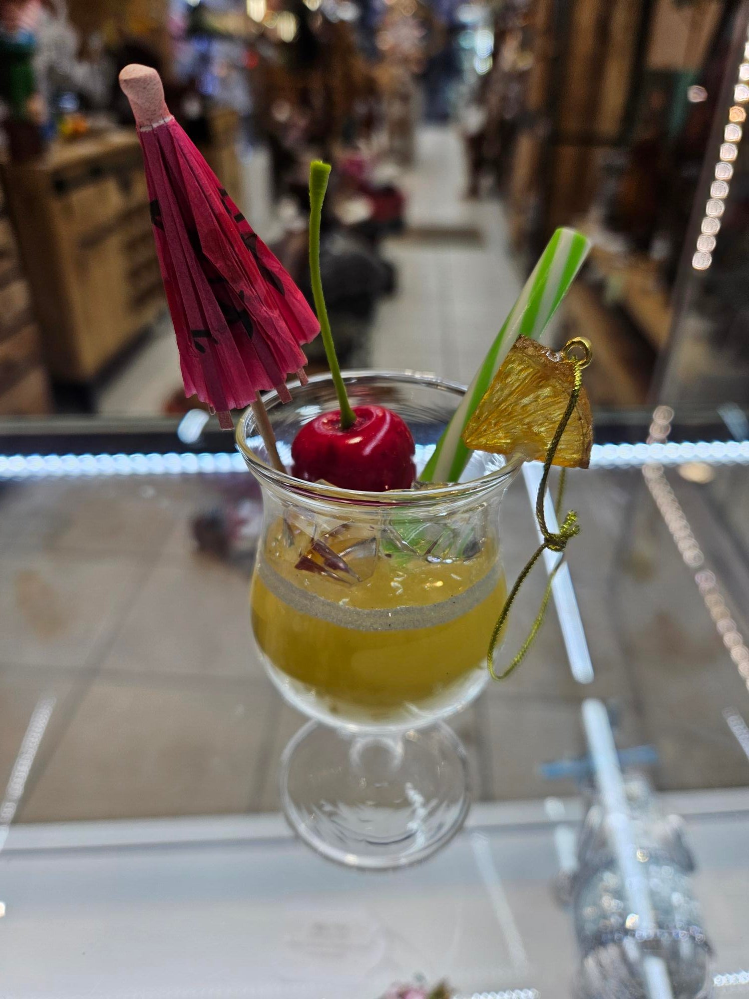 Une mini coupe à cocktail en vrai verre, remplie d’un apéro tropical miniature : glaçons, paille, cerise, tranche de fruit et petit parapluie… tout y est ! 🌴